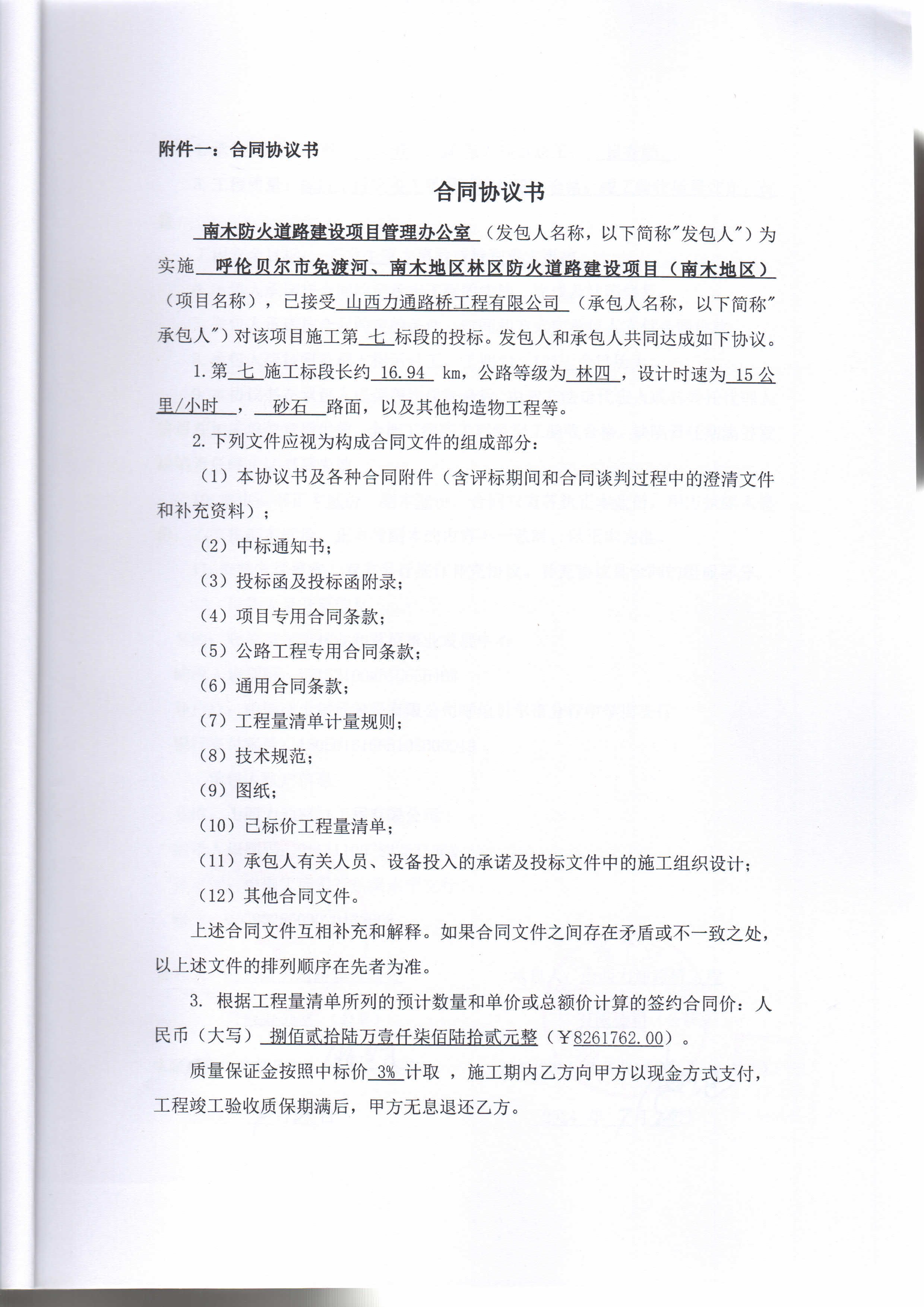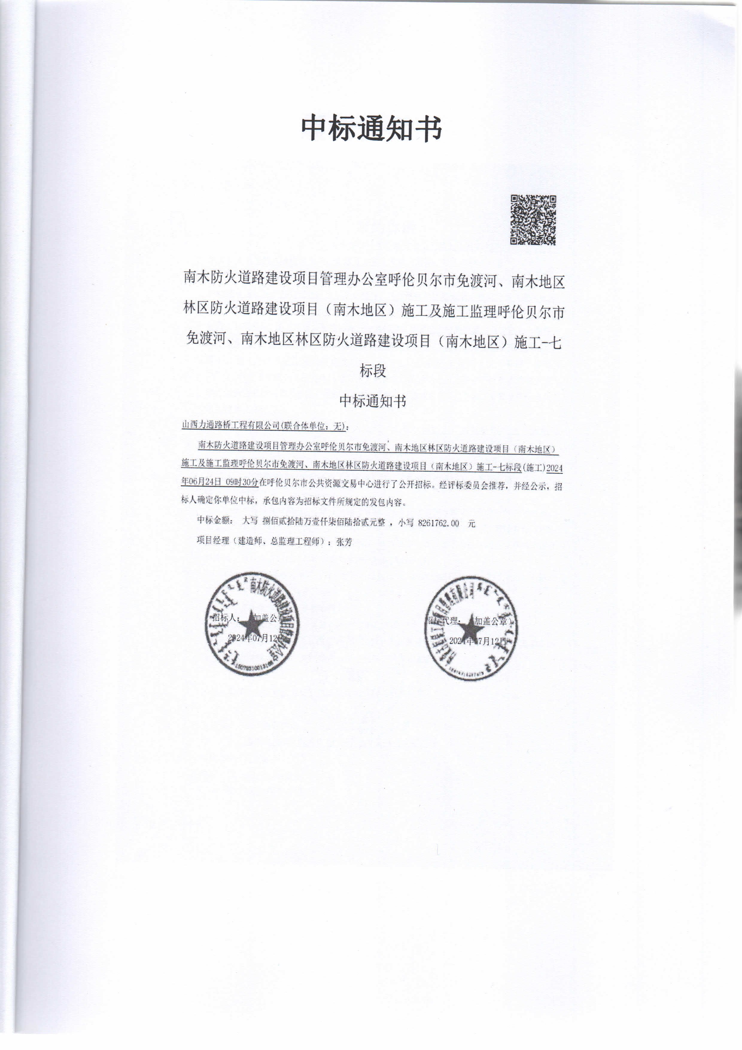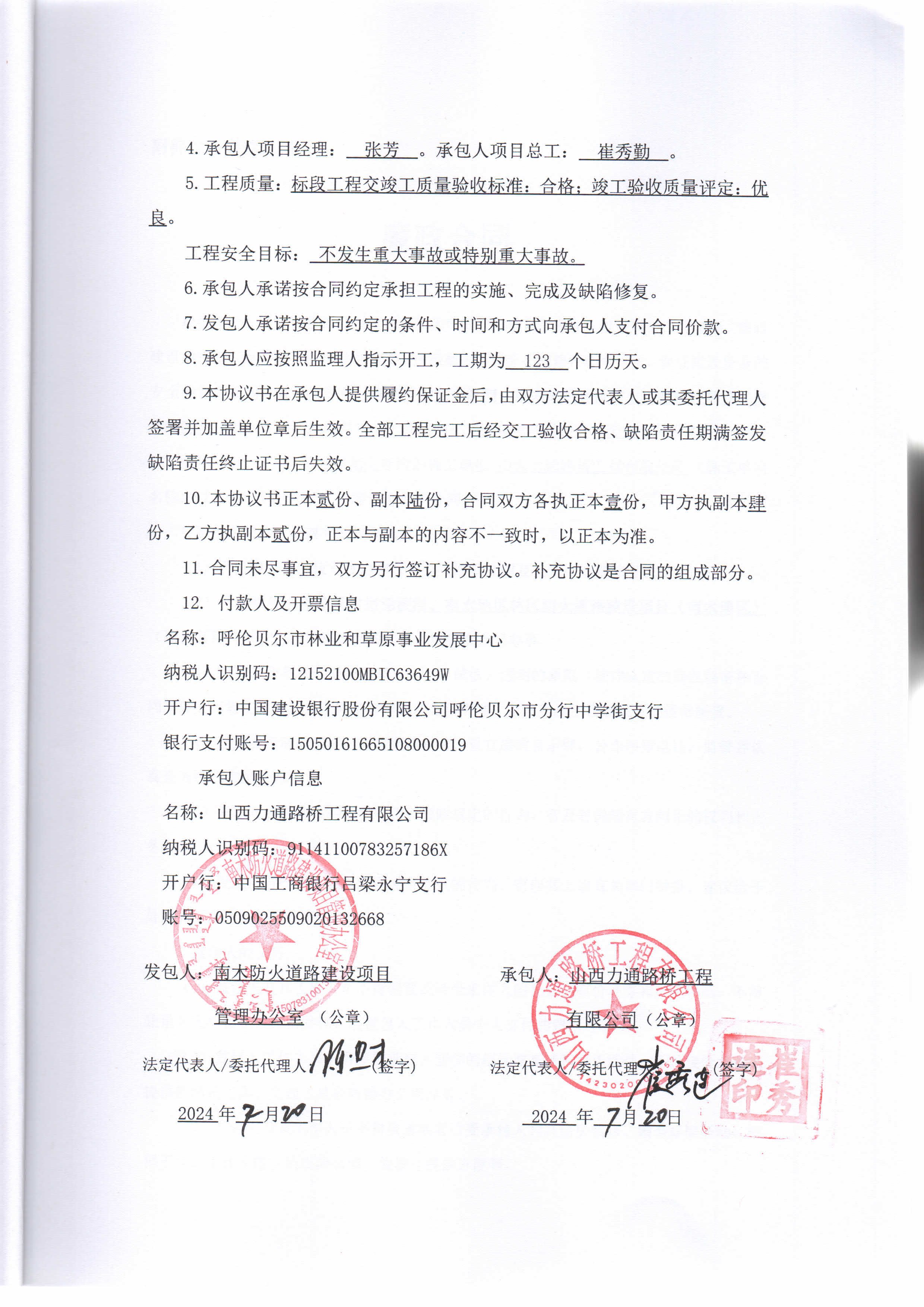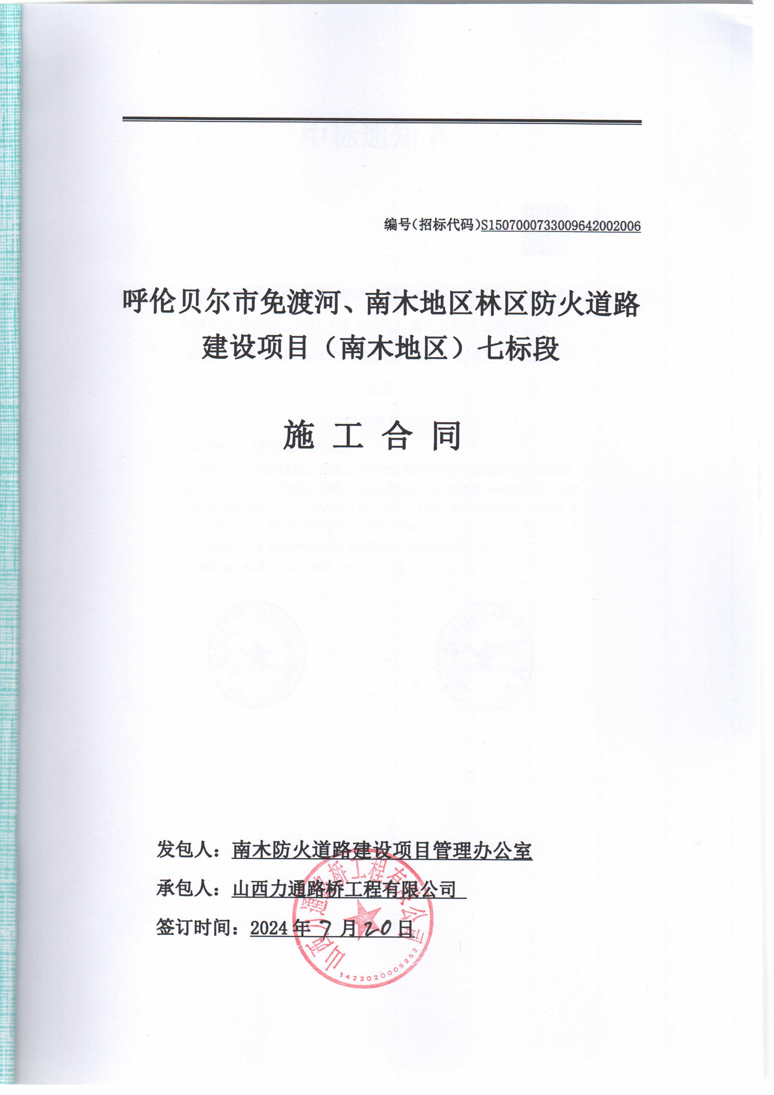 二、合同名称:呼伦贝尔市免渡河、南木地区林区防火道路建设项目(南木地区)施工七标段